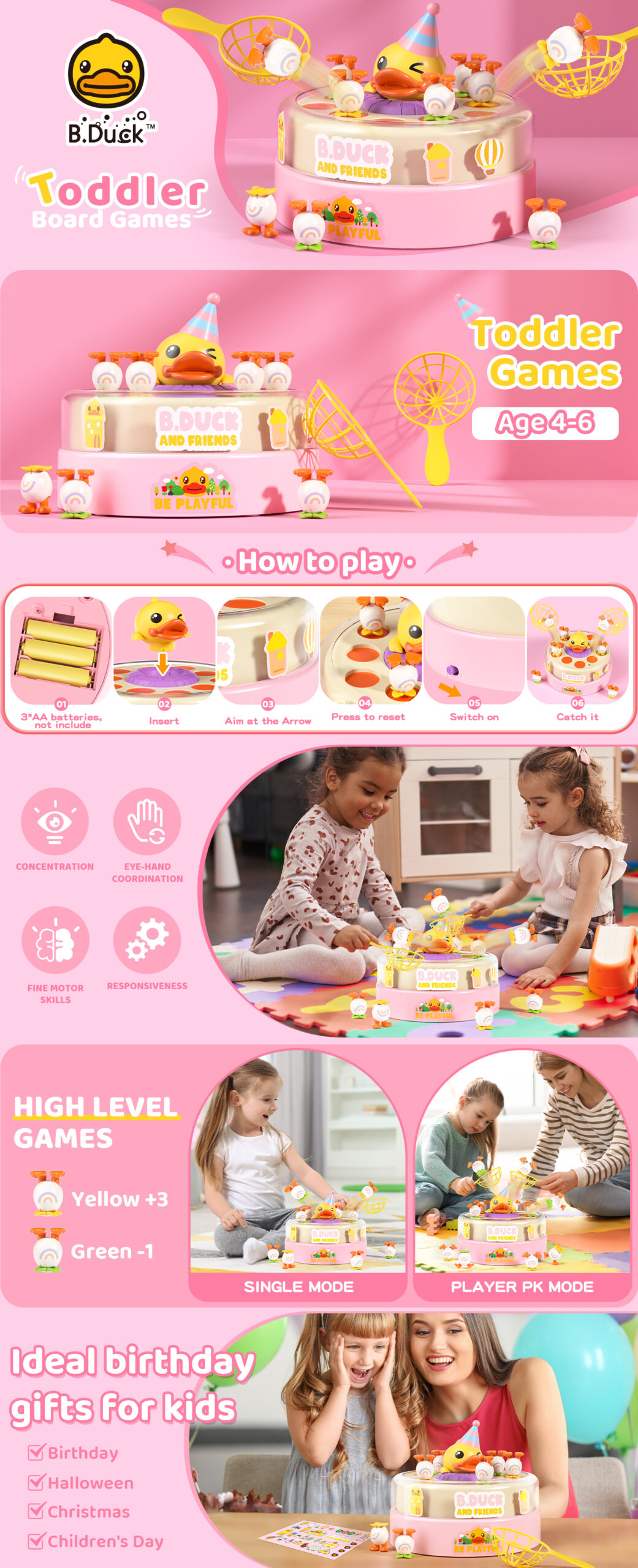 - Our toddler games is made of safe materials with smooth edges, safe for kids to play. The adorable B.DUCK design is copyright protected and features bright colors and birthday theme could attract children’s attention